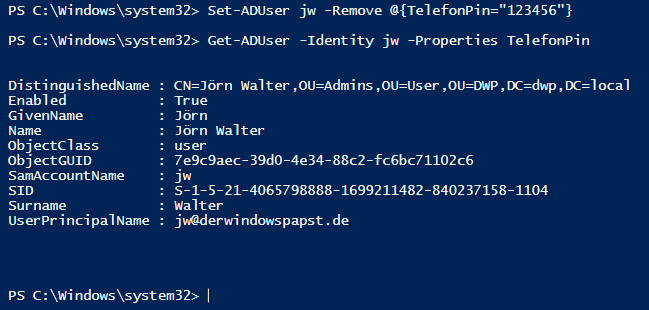 Set-ADUser jw -Remove @{TelefonPin=”123456″}