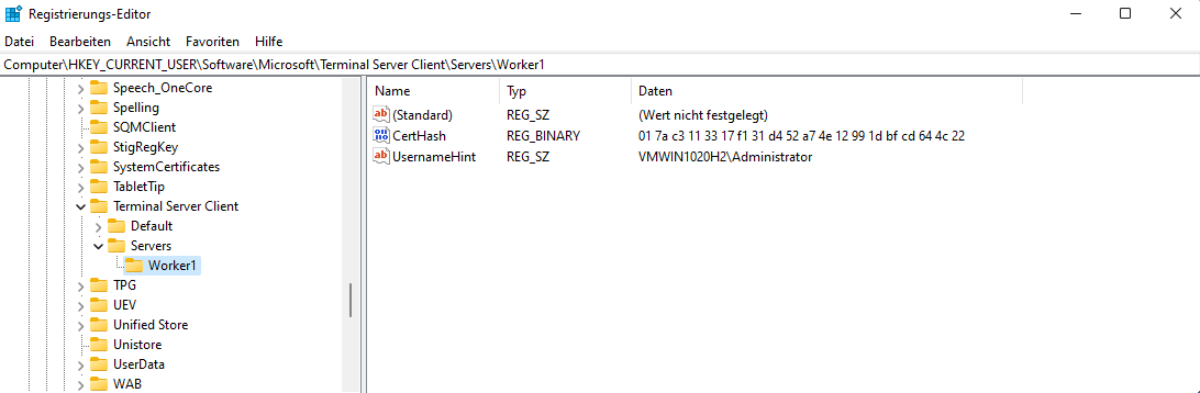 Würde man den Haken setzen und auf “Ja” klicken, würde auf dem Quell-Computer folgender Registyeintrag gesetzt werden. Dieser Eintrag verhindert die künftigen Zertifikatwarnungen zum angesteuerten Remote-Computer. Zusätzlich wird der zuletzt angezeigte Benutzer angezeigt.