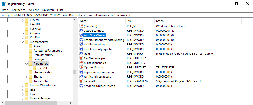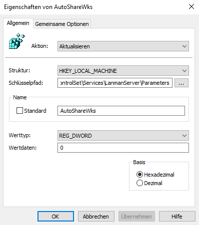Zur Risikominimierung von Malware, sollten die administrativen Freigaben entfernt werden. Alle anderen manuellen erstellen Freigaben bleiben nach der Deaktivierung erhalten.