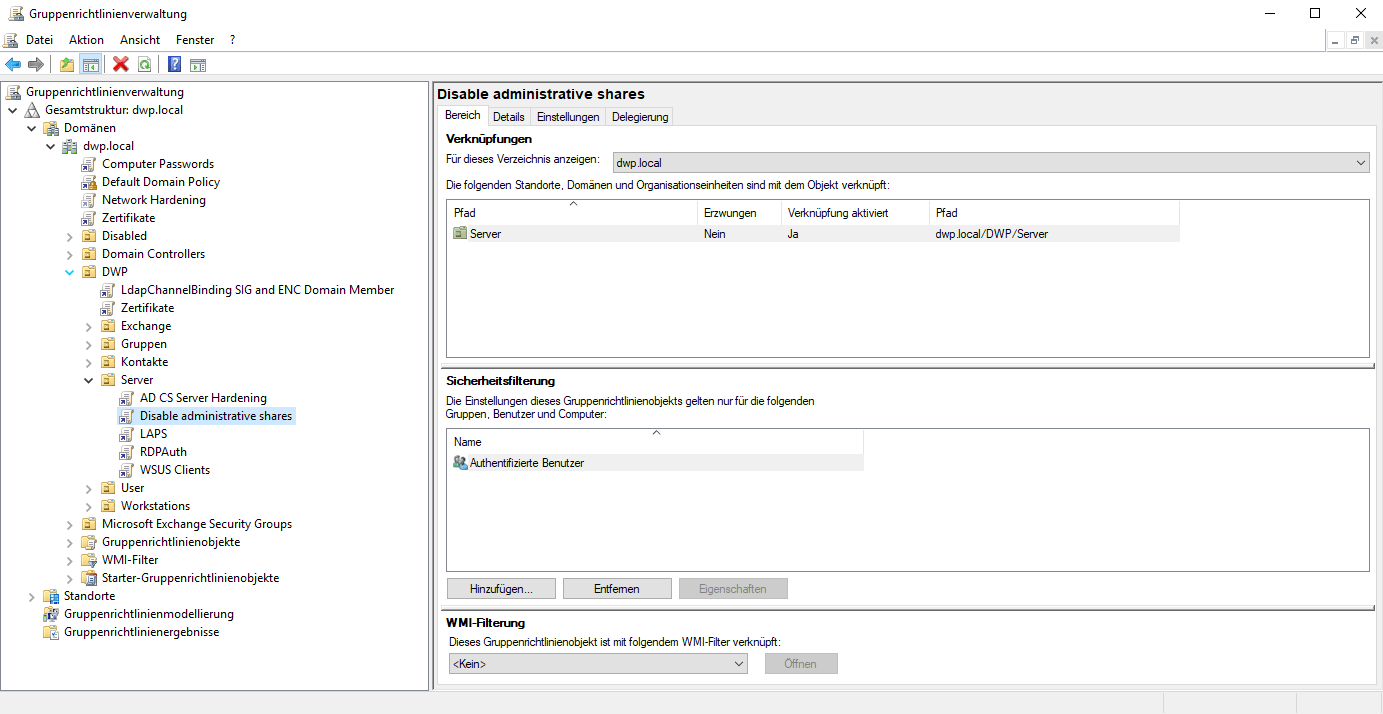 Zur Deaktivierung der versteckten administrativen Freigaben erstellen wir ein Gruppenrichtlinienobjekt mit folgenden Einstellungen.