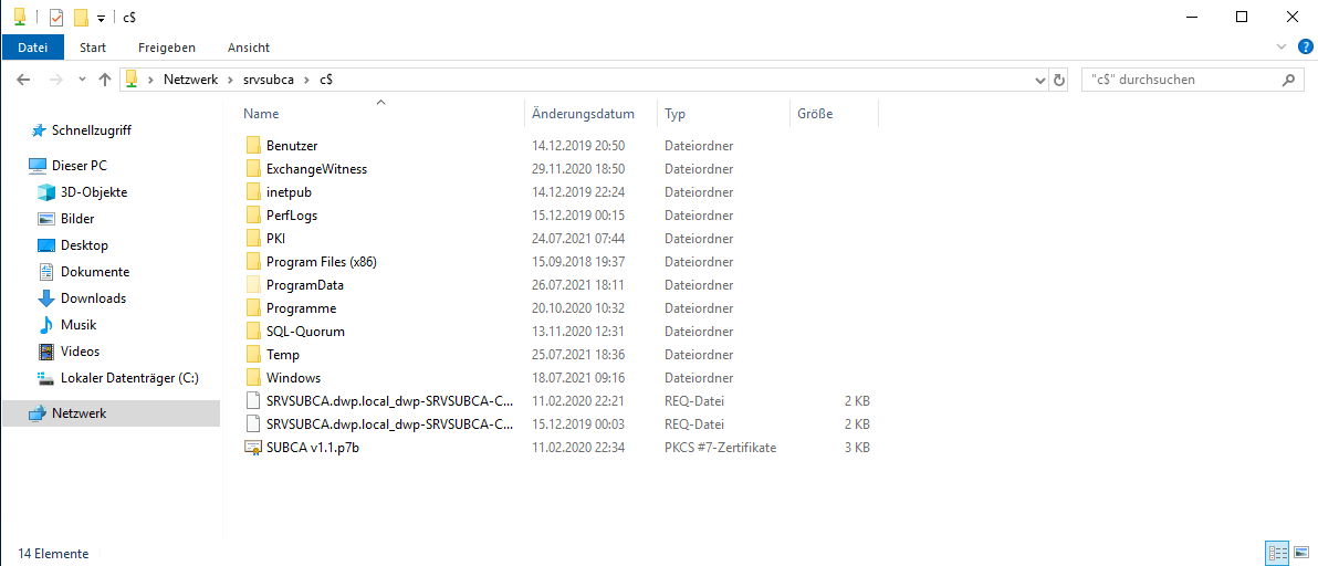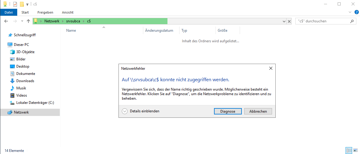 Die Ausgangsituation ist, das der Zugriff auf die administrativen Freigabe des Servers SRVSubCA aktuell noch möglich sind.