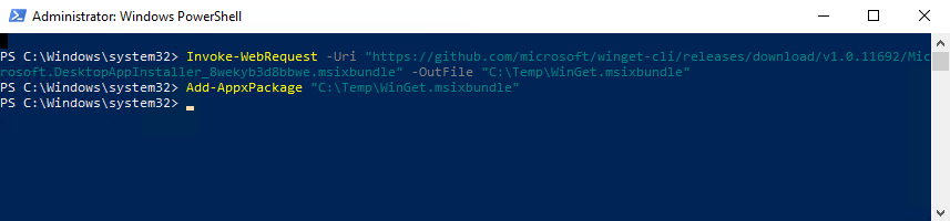 Add-AppxPackage “C:\Temp\WinGet.msixbundle”