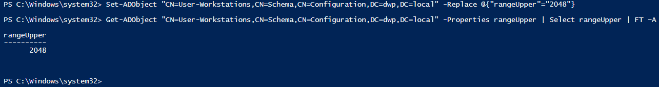 Set-ADObject “CN=User-Workstations,CN=Schema,CN=Configuration,DC=dwp,DC=local” -Replace @{“rangeUpper”=”2048”}