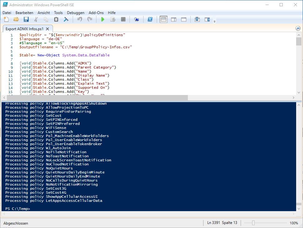Nach dem Start des Skript werden alle ADMX Dateien eingelesen und wichtige Informationen extrahiert und in eine .csv Datei geschrieben.