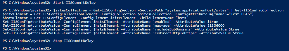 Set-IISConfigAttributeValue -ConfigElement $hstsElement -AttributeName “enabled” -AttributeValue $true