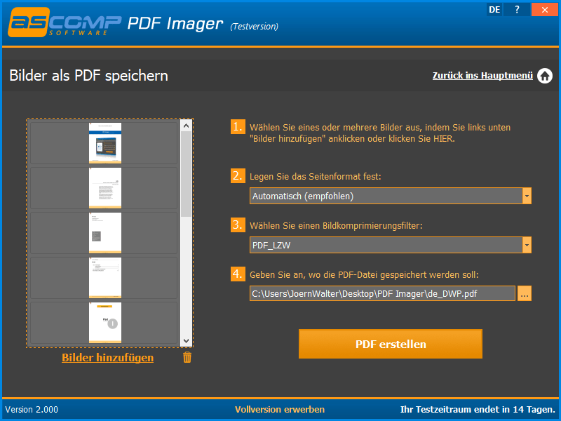 Auch für Umwandlungen in die andere Richtung ist PDF Imager die ideale Lösung! Erstellen Sie im Handumdrehen ein PDF-Dokument aus einem oder mehreren Bildern – ohne die Notwendigkeit eines teuren PDF-Editors!