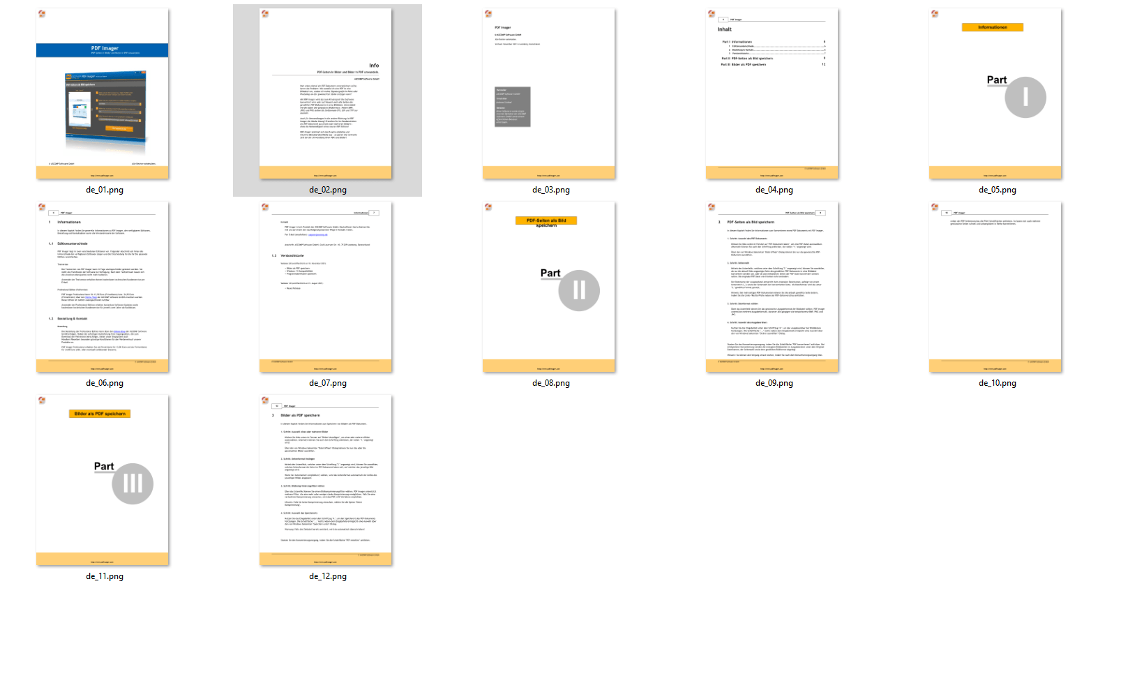 Mit PDF Imager wird das zum Kinderspiel! Die Software konvertiert eine oder auf Wunsch auch alle Seiten des gewählten PDF-Dokuments in eine Bilddatei. Unterstützt werden dabei die gängigsten Bildformate. Neben BMP, JPEG und PNG stehen als Zielformate EPS, GIF und TIFF zur Auswahl.