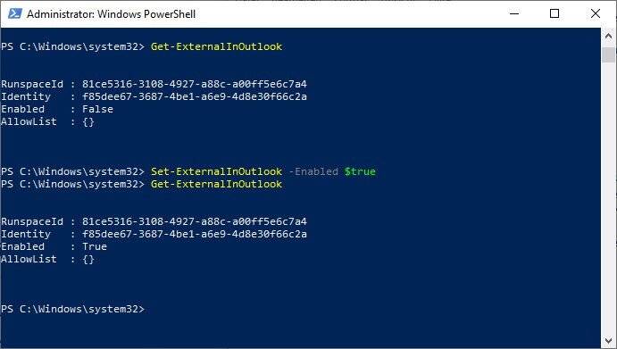 Set-ExternalInOutlook -Enabled $true