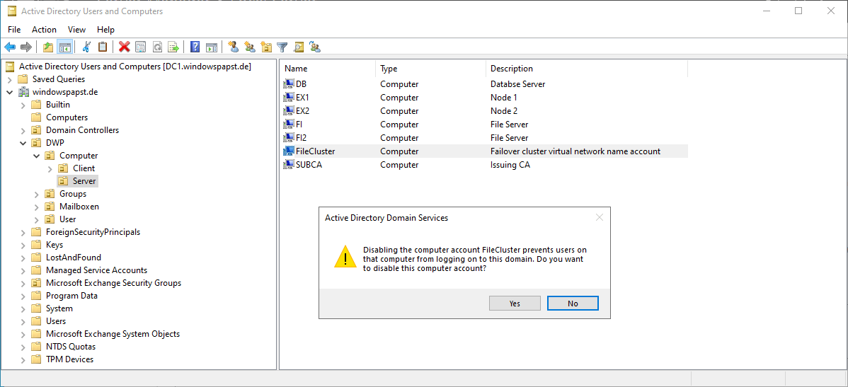 Zuerst deaktivieren wir das Computerobjekt im Active Directory.
