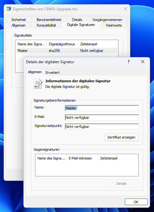 .\Signtool.exe sign /tr http://timestamp.digicert.com /td sha256 /fd sha256 /f “C:\Temp\SIGNCERT.pfx” /p sign “C:\Temp\CBMSI-Upgrade.msi”