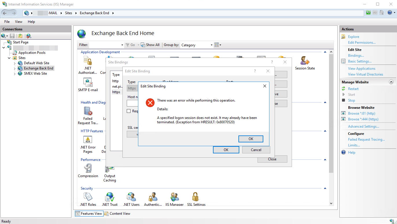 Auf einem Exchange Knoten kam es zu einem Fehler. OWA und ECP ließen sich nicht mehr öffnen. ECP meldete “The website cannot display the page“. OWA zeigte “Something went wrong” an. Als erstes prüfte ich die Zertifikate und die korrekte Bindung sowie die Berechtigungen auf die Zertifikate.