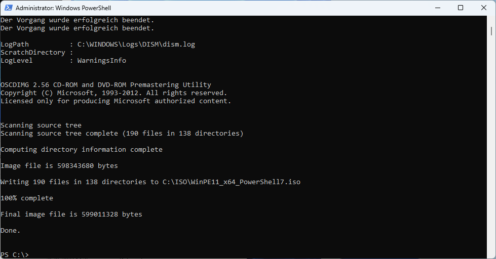Jetzt sind alle Voraussetzungen erfüllt und können das Skript zur Integration von Powershell 7 in WinPE starten. Das Skript zieht sich alle Komponenten die es braucht von allein, und zwar aus dem zuvor installiertem Windows ADK und Add-Ons. Die fertige WinPE liegt ganz klar im Ordner ISO.