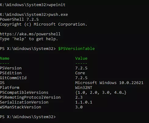 Nachdem die WinPE geladen und gestartet wurde, prüfen wir die Powershellversion.