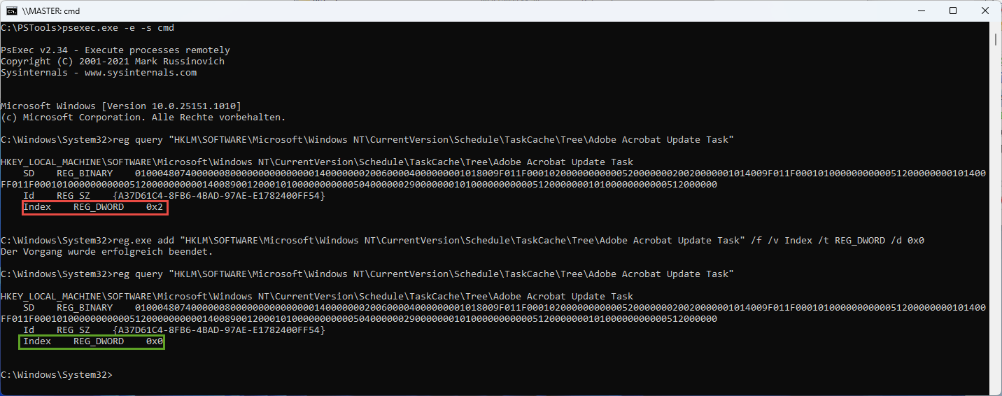 reg.exe add “HKLM\SOFTWARE\Microsoft\Windows NT\CurrentVersion\Schedule\TaskCache\Tree\Adobe Acrobat Update Task” /f /v Index /t REG_DWORD /d 0x0