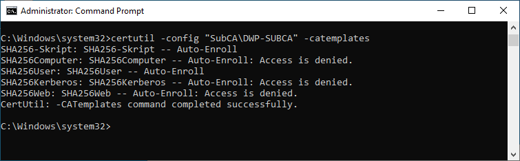 certutil -config “SubCa\DWP-SubCA” -catemplates