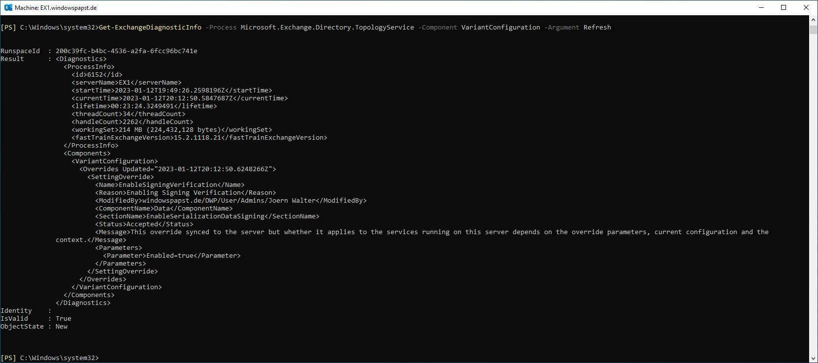 Get-ExchangeDiagnosticInfo -Process Microsoft.Exchange.Directory.TopologyService -Component VariantConfiguration -Argument Refresh