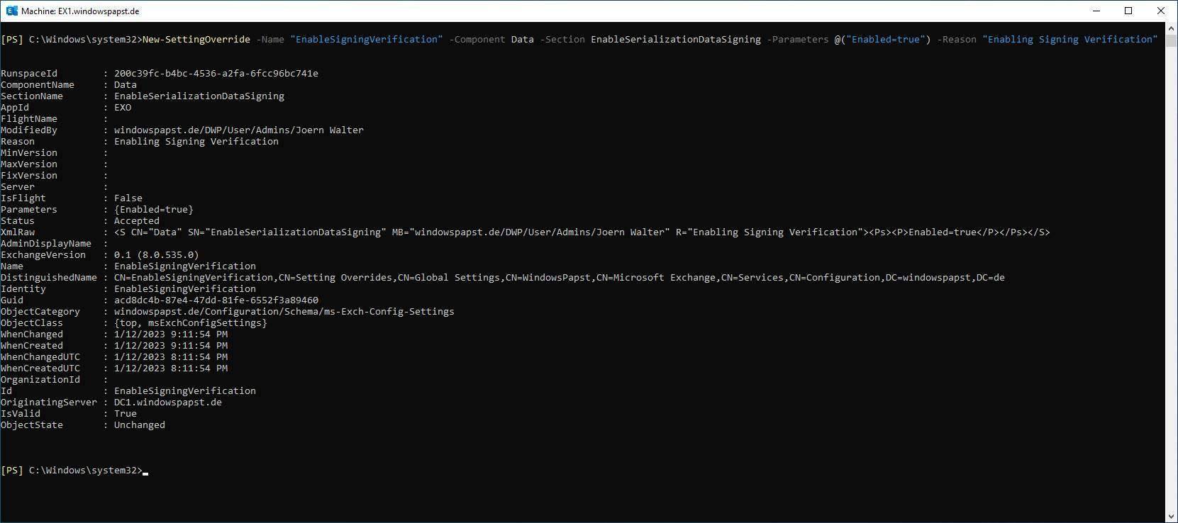 New-SettingOverride -Name “EnableSigningVerification” -Component Data -Section EnableSerializationDataSigning -Parameters @(“Enabled=true”) -Reason “Enabling Signing Verification”