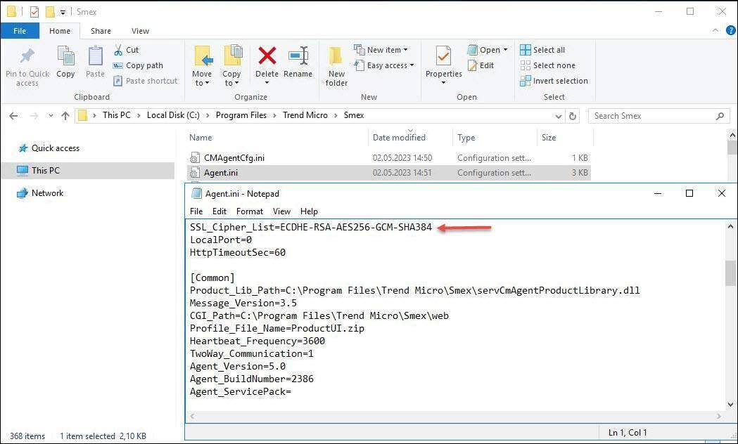 Die Agent.ini die dazu angepasst werden muss, findet man im Installationsverzeichnis. In meinem Fall C:\Programm Files (x86)\Trend Micro\Smex
