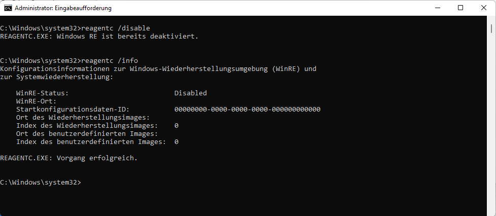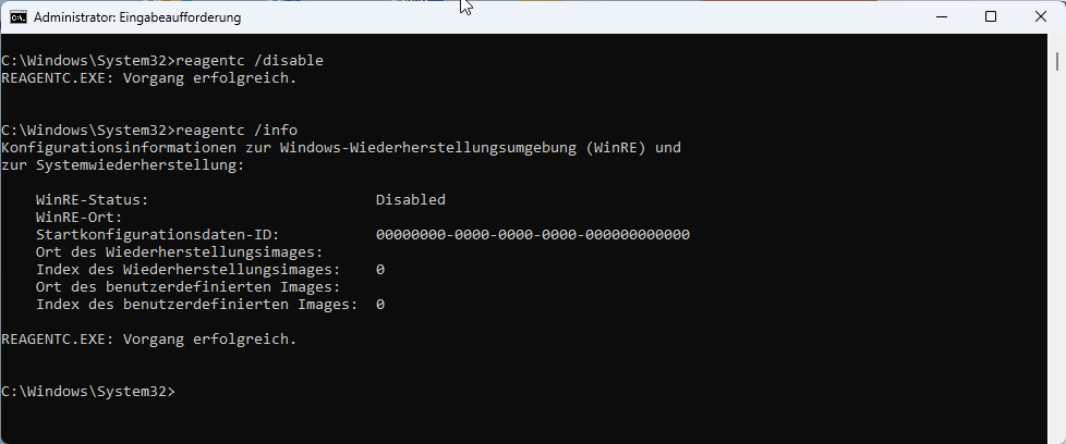 Bevor wir damit starten die Partition wiederherzustellen (neu zu erstellen), deaktivieren wir die Wiederherstellungsumgebung, damit das WinRE-Image nach C:\Windows\System32\Recovery kopiert werden kann.