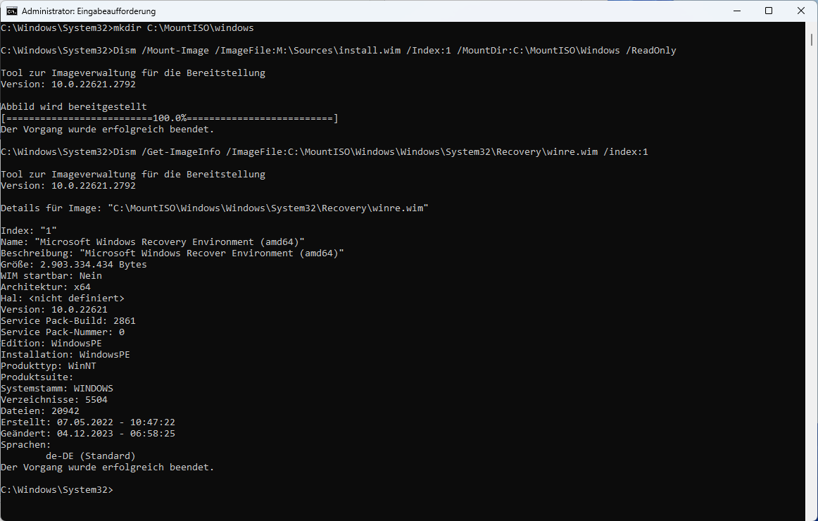- Dism /Get-ImageInfo /ImageFile:C:\MountISO\Windows\Windows\System32\Recovery\winre.wim /index:1