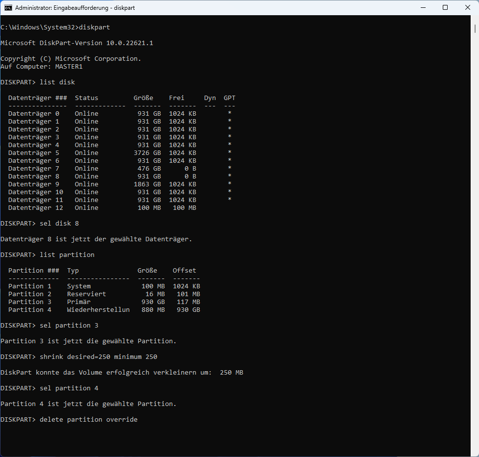 Im nächsten Schritt löschen wir die aktuelle Wiederherstellungsumgebung, dazu müssen wir diese vom (Typ = Wiederherstellung) aber zuerst markieren und zwar mit dem Befehl sel partition 4. Jetzt löschen wir die Partition und zwar mit dem Befehl delete partition override.