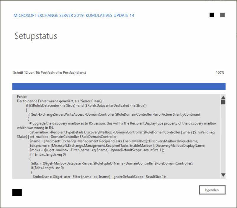 Exchange Setupstatus Schritt 12 von 16 Postfachrolle Postfachdienst Error