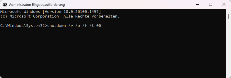– Gib den Befehl shutdown /r /o /f /t 00 ein und drücke Enter.
