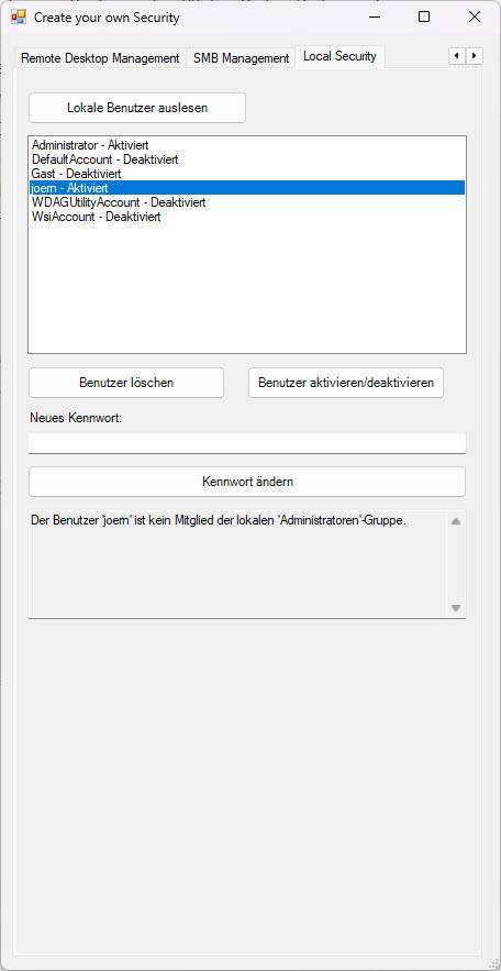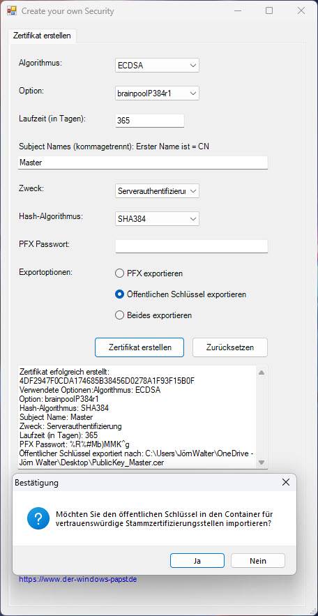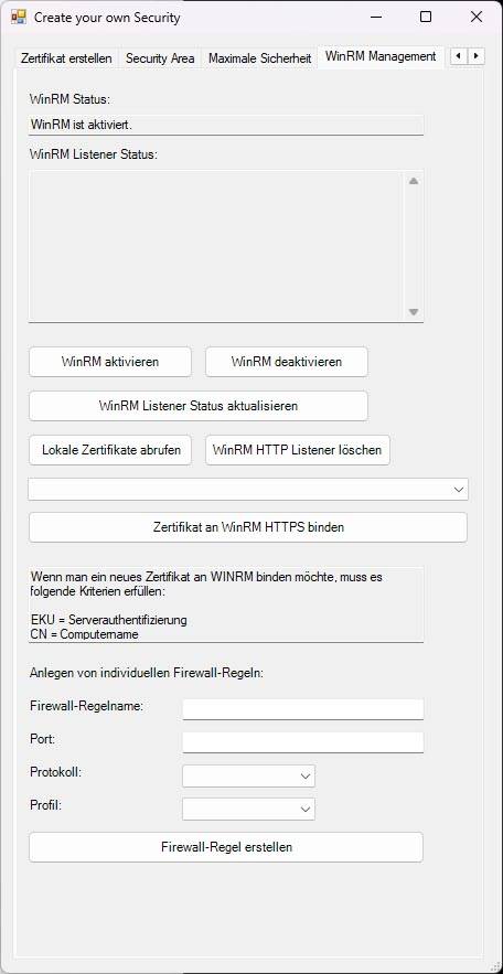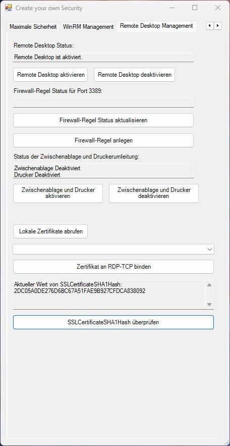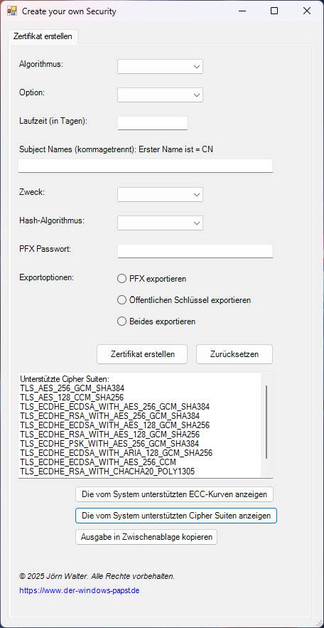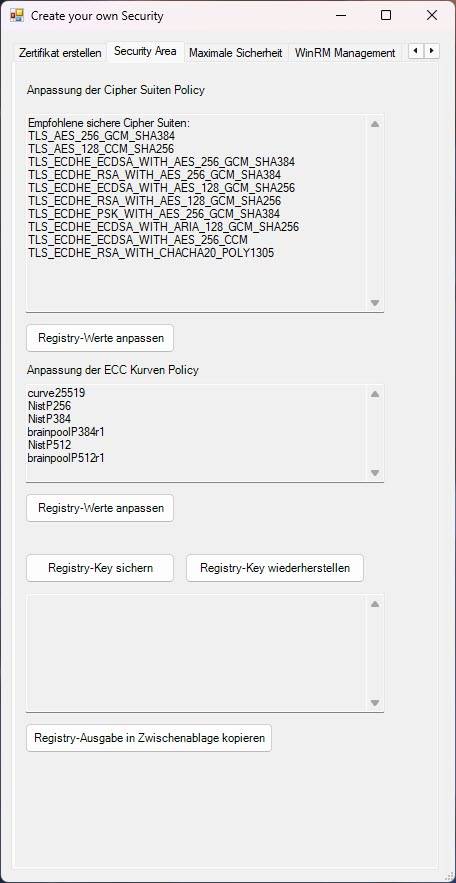 Ich habe das Tool für meine Bedürfnisse erweitert. Nun kann man die erstellen Zertifikate als .PFX und .CER exportieren, sofern man möchte. Wenn gewünscht importiert es das öffentliche Zertifikat direkt in den Root-Container. Außerdem kann die Laufzeit der Zertifikate individuell angepasst werden. Darüber hinaus zeigt das Tool nun auch die vom System unterstützten Cipher Suiten und ECC Kurven an. Auch die empfohlenen Cipher Suites und ECC Kurven lassen sich direkt ins System integrieren. Sollte kein Kennwort vergeben worden sein, so wird eins generiert und in der Ausgabe angezeigt. Der Inhalt der Ausgabe kann in die Zwischenablage übernommen werden. Das System lässt sich jetzt auch nach dem PCI-DSS Standard absichern. Für alle Vorgänge lassen sich die Registry-Hives sichern und wiederherstellen. Das Windows Remotemanagent zur kompletten Verwaltung inkl. Bindung eines Zertifikats an einen HTTPS-Listener. Firewall-Regeln lassen sich schnell erstellen. RDP lässt sich auch steuern und einrichten. Das Thema SMB habe ich auch mit aufgenommen. Über den letzten Tab kann man die lokalen User auslesen und managen. Einfach geil!