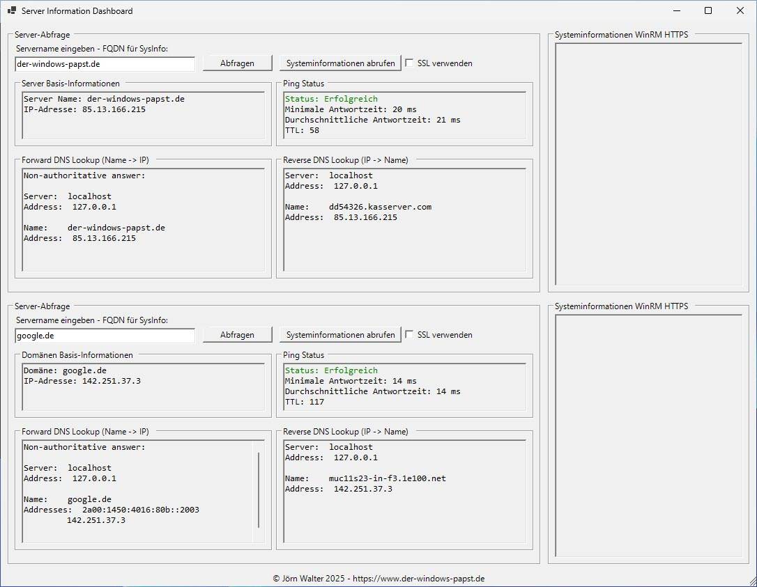 Der Abruf der Information wird mit New-PSSession realisiert. Habe dabei die Möglichkeit berückstigt, das nicht jeder WinRM over SSL unterstützt, daher auch die Checkbox. And diesem Beispiel ist zu erkennen, das der entfernte Server nur über einen HTTPS-Listener ansprechbar ist.