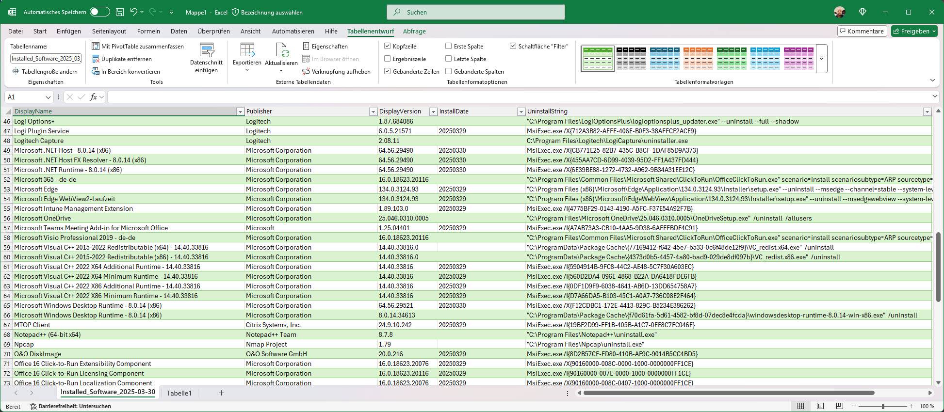Ein kleines Powershell-Skript zum Auslesen von installierter Software. Nach dem Start wird direkt nach der installierten Software gesucht und angezeigt. Über einen Doppelklick oder markiert und dem Button “Ausgewählte Software deinstallieren”, wird diese entfernt. Nach der Deinstallation wird die Ansicht automatisch aktualisiert. Die installierte Software lässt sich auch als CSV Datei exportieren.