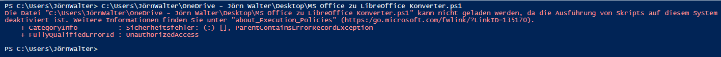 Die Datei “C:\Users\JörnWalter\OneDrive – Jörn Walter\Desktop\MS Office zu LibreOffice Konverter.ps1” kann nicht geladen werden, da die Ausführung von Skripts auf diesem Systemvdeaktiviert ist. Weitere Informationen finden Sie unter “about_Execution_Policies” (https:/go.microsoft.com/fwlink/?LinkID=135170).