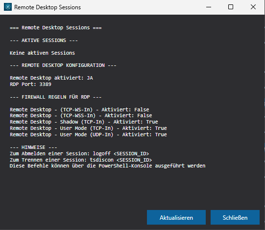- Firewall-Regeln: Anzeige relevanter RDP-Firewall-Regeln.