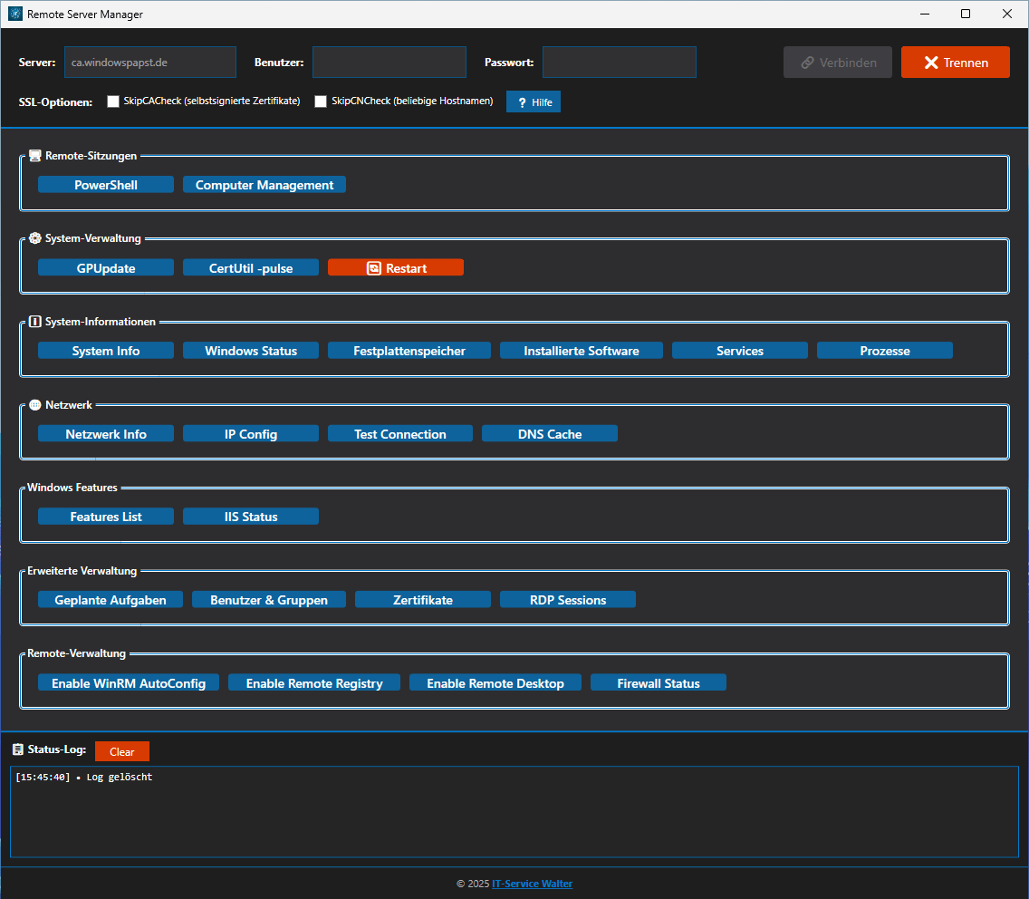 Der Server Manager Pro ist eine professionelle Windows-Anwendung zur zentralen Verwaltung mehrerer Windows-Server. Mit dem integrierten Multi-Server Dashboard, sicherer Passwortverschlüsselung und umfangreichen Administrationswerkzeugen bietet die Software alle notwendigen Tools für die effiziente Server-Verwaltung aus einer Oberfläche.
