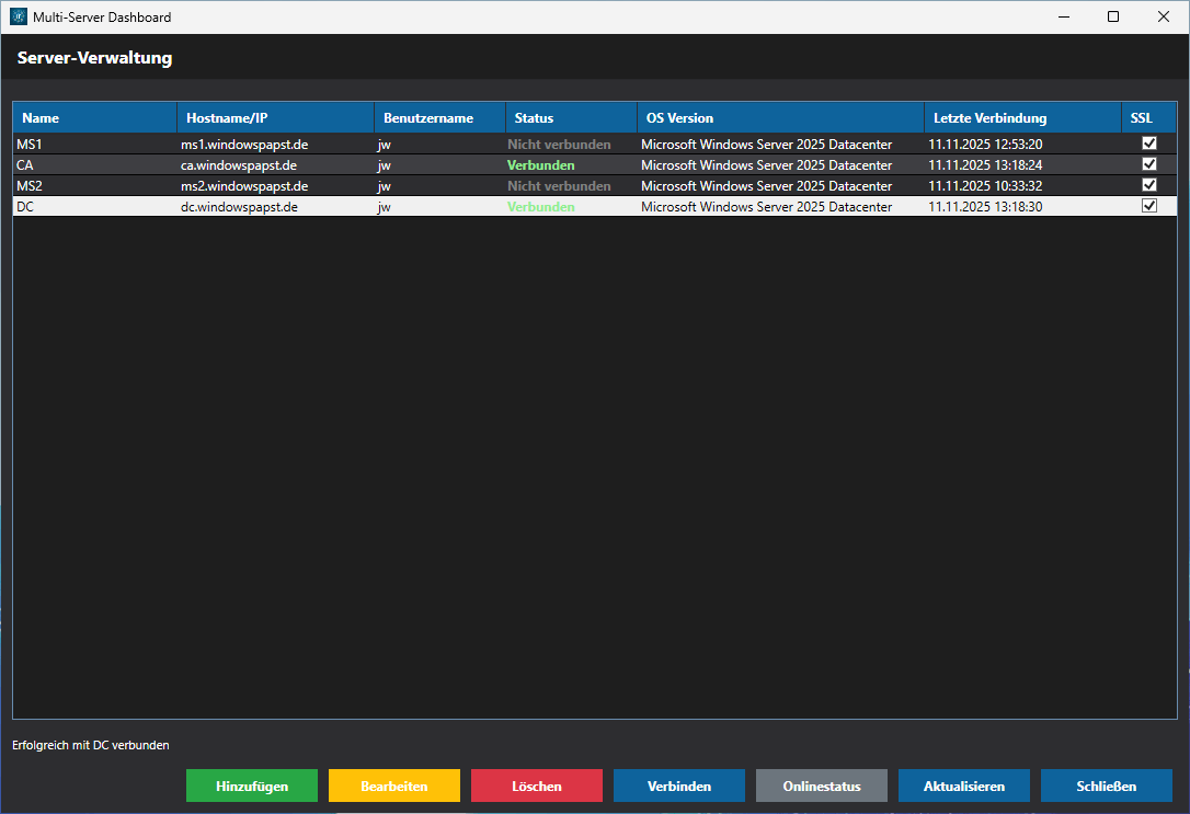 - Echtzeit-Statusanzeige: Sehen Sie auf einen Blick, welche Server verbunden, getrennt oder fehlerhaft sind.