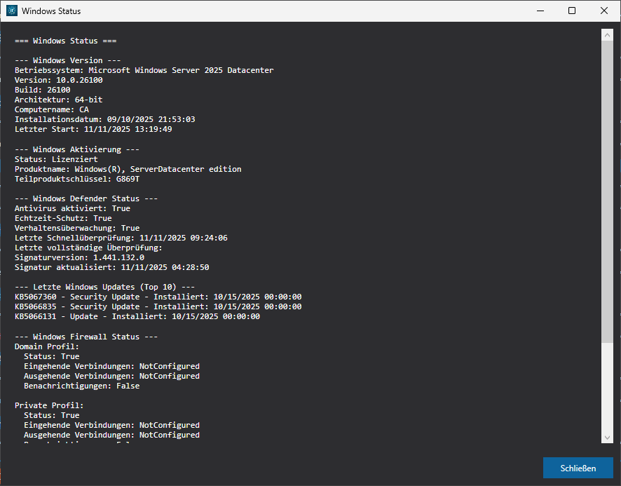 - Firewall Status: Detaillierte Anzeige aller drei Firewall-Profile (Domain, Private, Public).