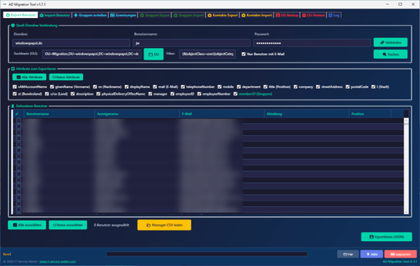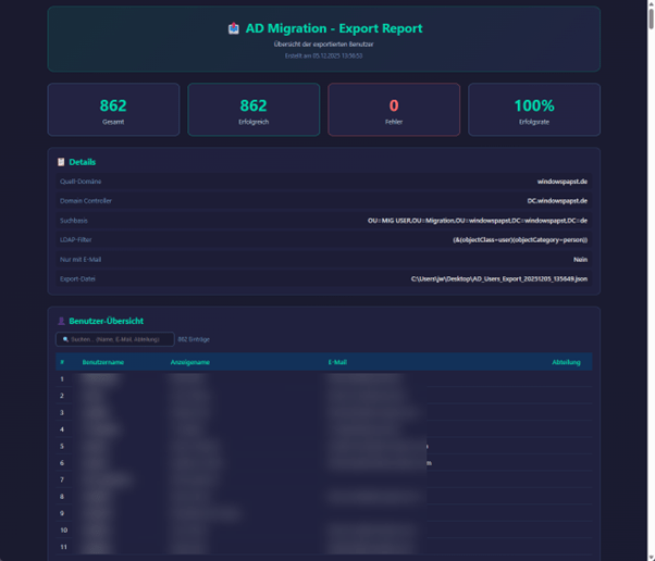 Exportiert Benutzer aus der Quell-Domäne in eine JSON-Datei für den späteren Import.