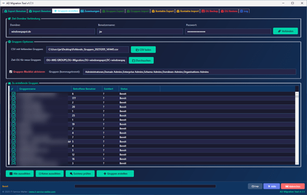 Erstellt fehlende Gruppen in der Ziel-Domäne. Diese Funktion wird benötigt, wenn beim Import Gruppenzuweisungen fehlschlagen, weil die Gruppen noch nicht existieren.