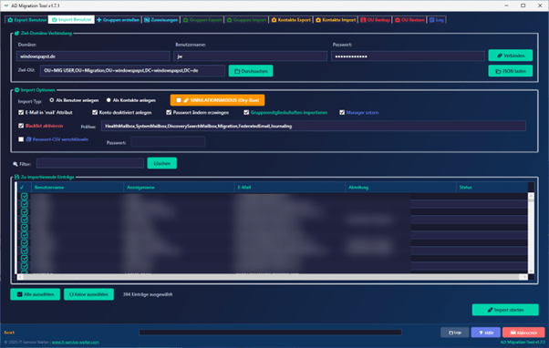 - Blacklist: System-Konten automatisch überspringen (HealthMailbox, SystemMailbox, etc.)