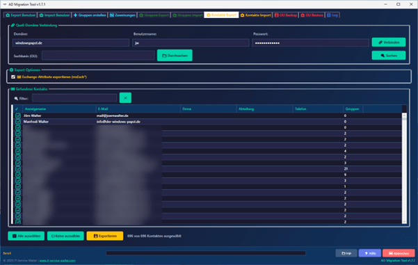 Benutzer, alle Gruppen-Typen (mit allen seinen Mitgliedern auch möglich, optional mit Exchange-Attributen) und Kontakte zwischen Active Directory Domänen migrieren, oder als Backup für die lokale Domäne verwenden.