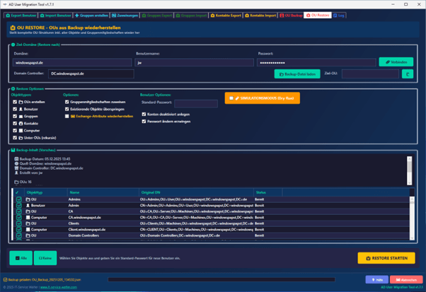 - OU Restore (Tab 10) → stellt alles in der Ziel-Domäne wieder her