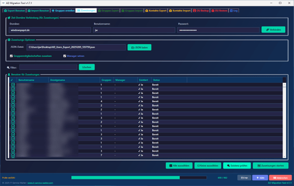 Beim Benutzer-Import werden Manager-Beziehungen geprüft. Wenn ein Manager noch nicht in der Zieldomäne existiert, kann die Zuweisung nicht erfolgen. Das Tool erstellt dann automatisch eine CSV-Datei Fehlende_Manager_*.csv mit allen fehlenden Managern.