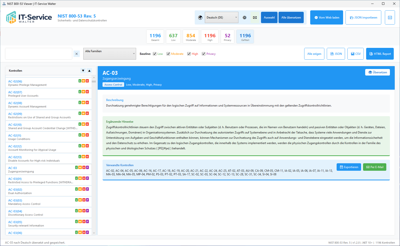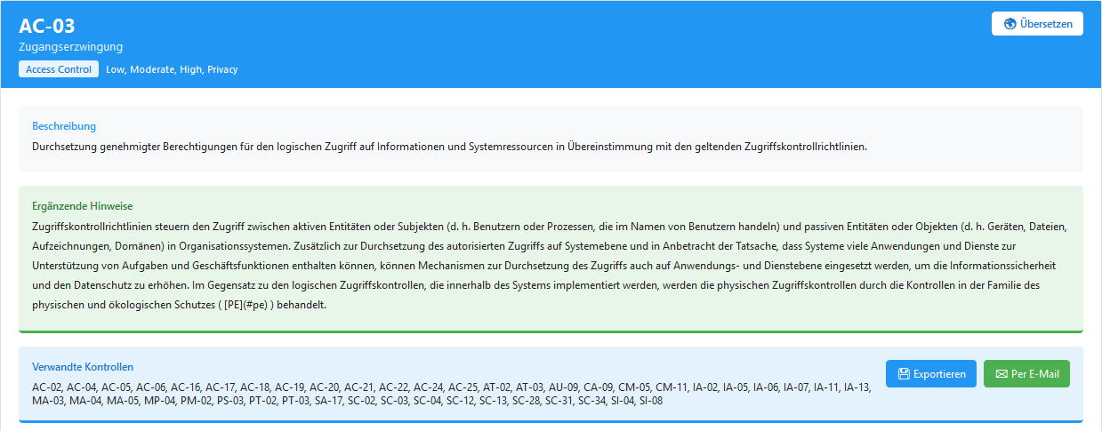 Mit dem NIST 800-53 Viewer exportieren Sie AC-2 mit einem Klick auf “Exportieren” oder “Per E-Mail” und erhalten einen HTML-Report mit AC-2 und allen 15 verwandten Kontrollen – vollständig dokumentiert und sofort einsatzbereit.