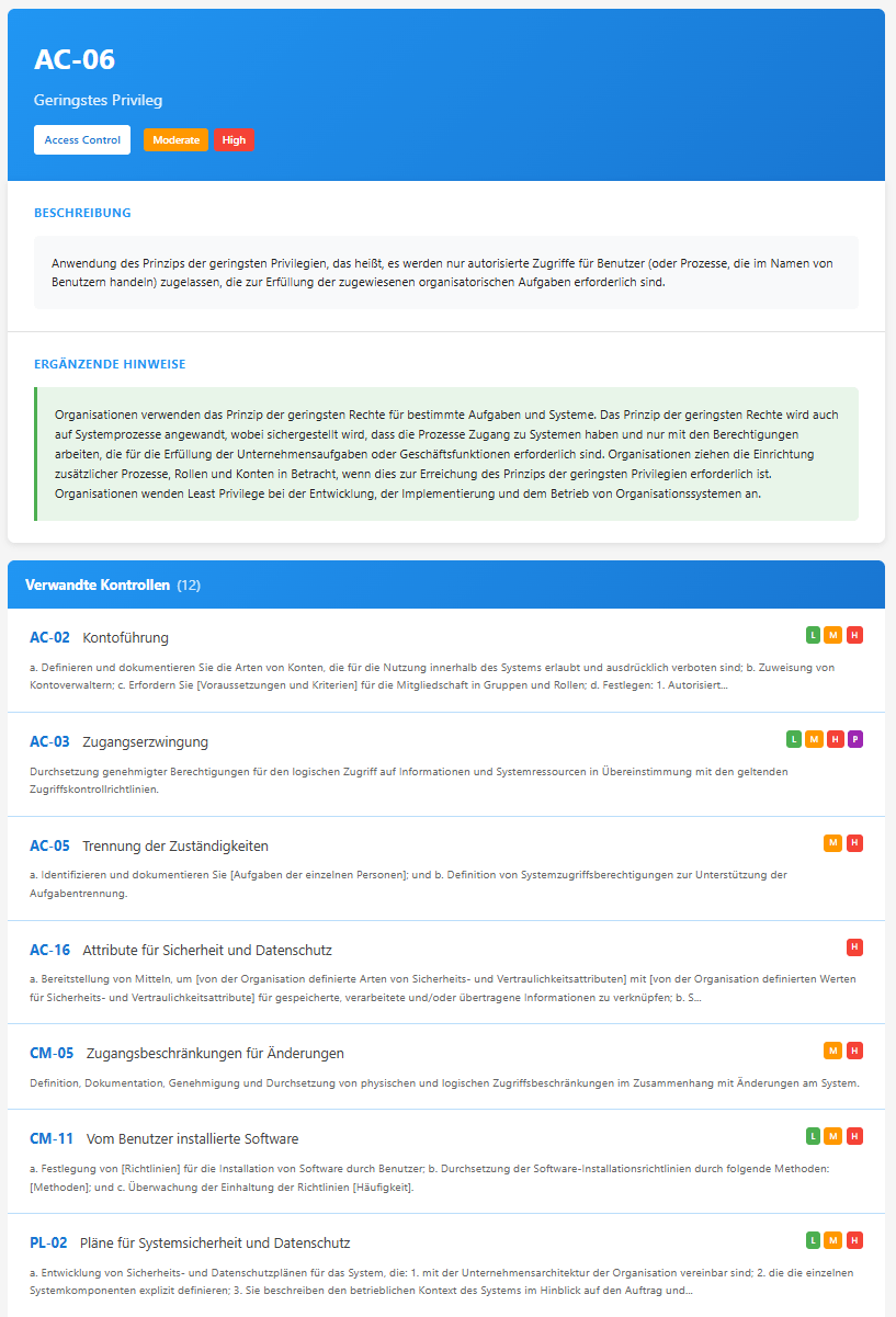 NIST 800-53 Kontrollen verweisen häufig auf andere Kontrollen. Wenn Sie beispielsweise AC-2 (Account Management) betrachten, finden Sie Verweise auf AC-3, AC-5, AC-6, IA-2, IA-4 und viele weitere. Um eine Kontrolle vollständig zu verstehen und umzusetzen, müssen Sie oft 10-20 verknüpfte Kontrollen nachschlagen – ein zeitaufwändiger Prozess.