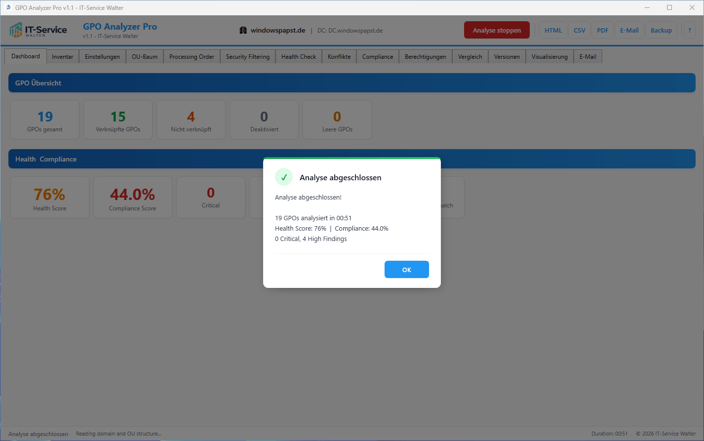 Das Tool liest alle GPOs, deren Einstellungen, Berechtigungen, Verknüpfungen und SYSVOL-Versionen aus dem Active Directory und bereitet die Ergebnisse in einer modernen, übersichtlichen Benutzeroberfläche auf. Es ersetzt zeitaufwändige manuelle Prüfungen durch automatisierte Analyse und liefert sofort umsetzbare Handlungsempfehlungen.