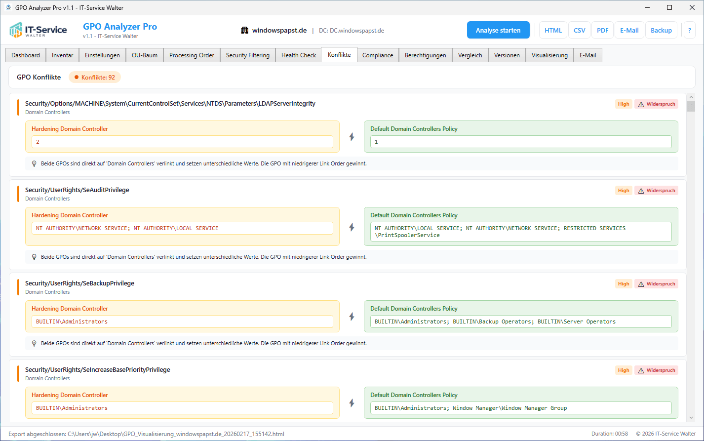 - Benötigen einen dokumentierten Nachweis der GPO-Konfiguration. Die Export-Funktionen (HTML, PDF, CSV) liefern professionelle Berichte im Corporate Design.