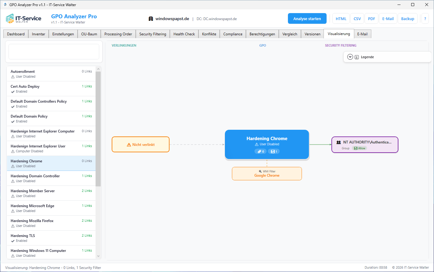 - Erfasst alle GPOs der Domäne mit Status, Verknüpfungen, WMI-Filtern, Besitzer und Versionen. Identifiziert leere, nicht verknüpfte und deaktivierte GPOs.