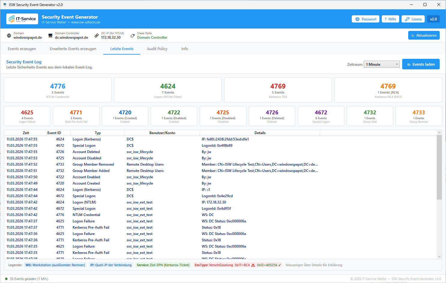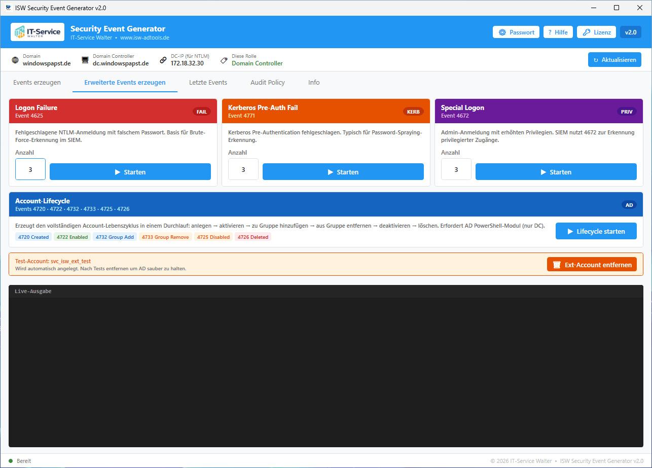 Der ISW Security Event Generator ist ein professionelles Windows-Desktop-Tool für IT-Administratoren und Security-Engineers. Es ermöglicht die gezielte, kontrollierte Erzeugung von Authentifizierungsevents im Windows Security Event-Log – ohne echte Angriffe, ohne externe Abhängigkeiten und ohne Cloud-Dienste.