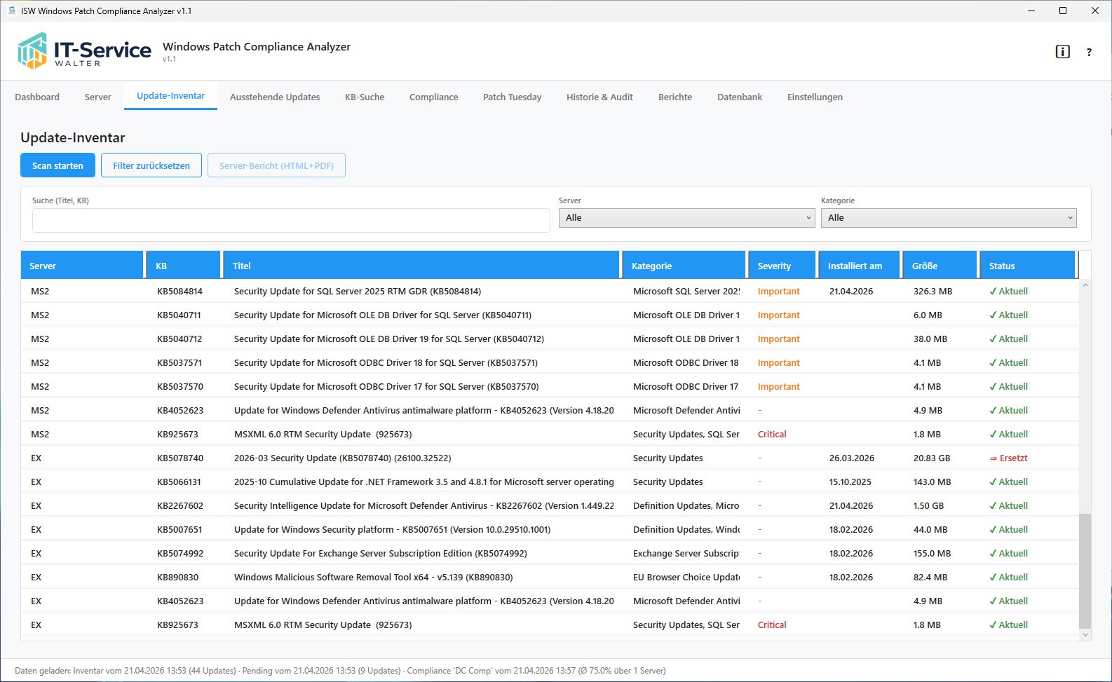 Tab KB-Suche → Matrix-Darstellung: welcher Server hat welches KB.