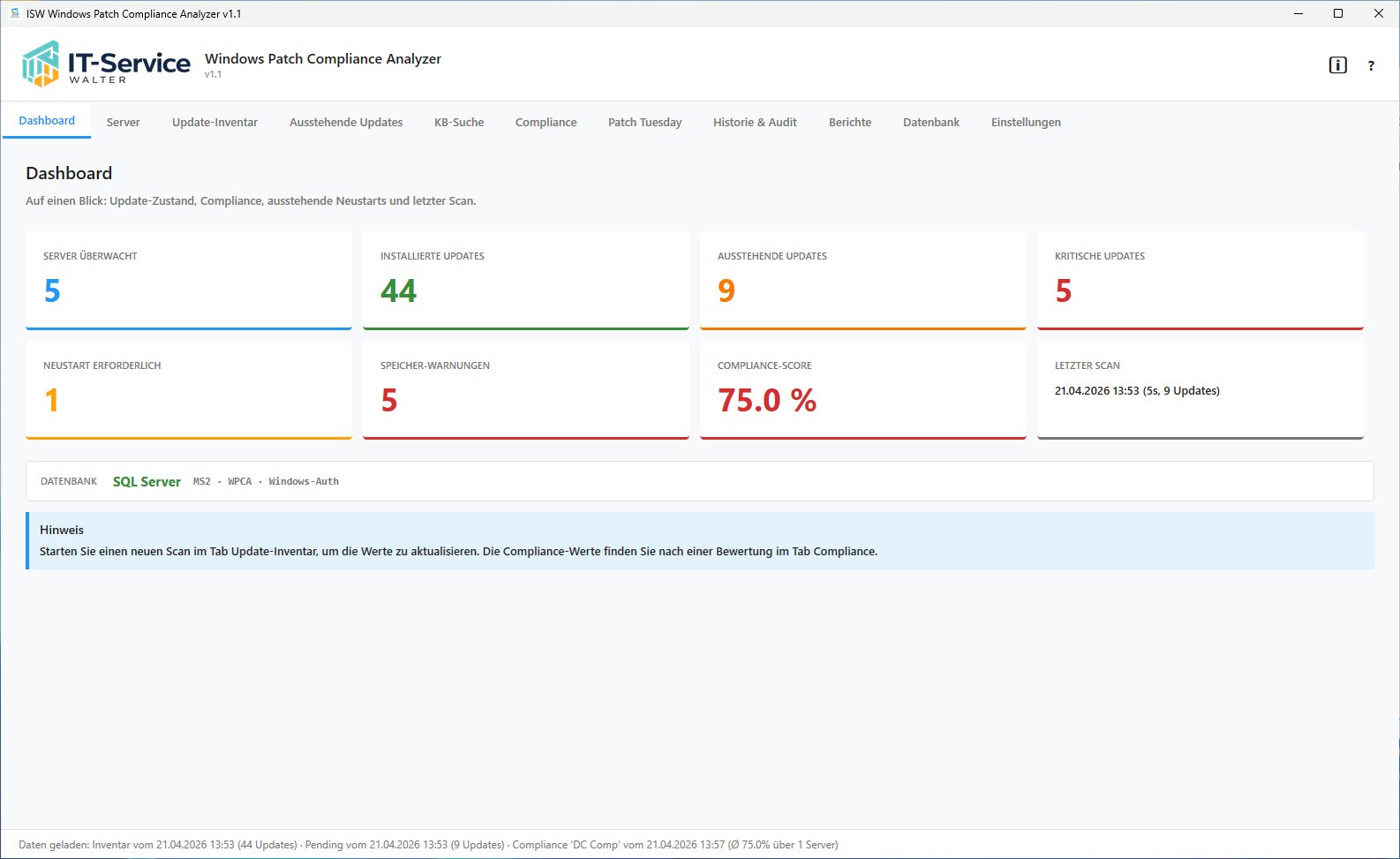 Der ISW Windows Patch Compliance Analyzer (WPCA) ist ein Windows-Administrationswerkzeug für IT-Verantwortliche, die jederzeit belegen müssen, welche Updates auf welchen Servern installiert sind — und was fehlt. Das Tool arbeitet agentenlos über die native Windows Update Agent API und PowerShell Remoting (WinRM), benötigt also auf den Zielservern keinerlei Installation.