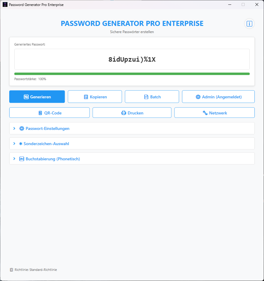 Der Password Generator Pro Enterprise ist eine speziell für Unternehmensumgebungen entwickelte Offline-Lösung zur sicheren Generierung von Passwörtern. Das Tool richtet sich primär an IT-Helpdesks, Systemadministratoren und Compliance-Verantwortliche, die höchste Sicherheitsstandards bei der Passwort-Erstellung gewährleisten müssen.